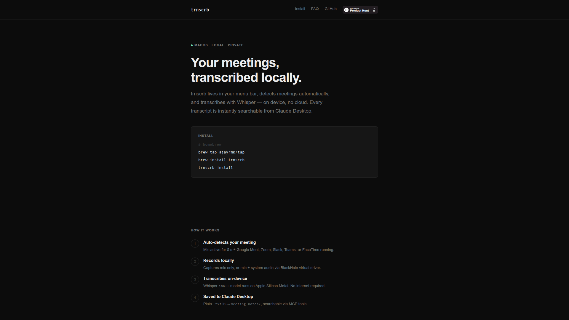 automatic meeting detectionlocal on‑device transcriptionmic and system audio captureplain text transcript storagesearchable notes in Claude Desktopoffline operation for privacy