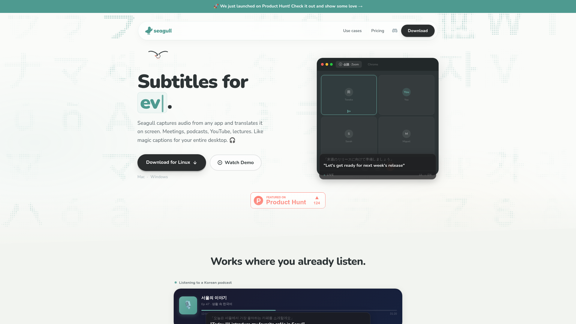For people listening to foreign-language audio who can't understand what's being said in real time, Seagull captures any app audio and shows translated captions so they can follow along without switching apps or tools