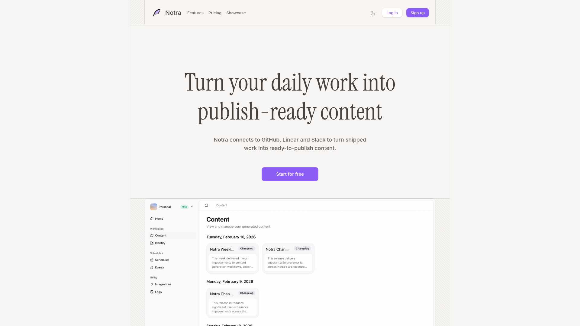 Notra turns day-to-day product work into publish-ready marketing content. It connects to tools like GitHub, Linear, and Slack to capture shipped work and then drafts structured outputs such as changelogs, blog posts, and social updates—helping teams reduce the manual effort of release communications and content repurposing.