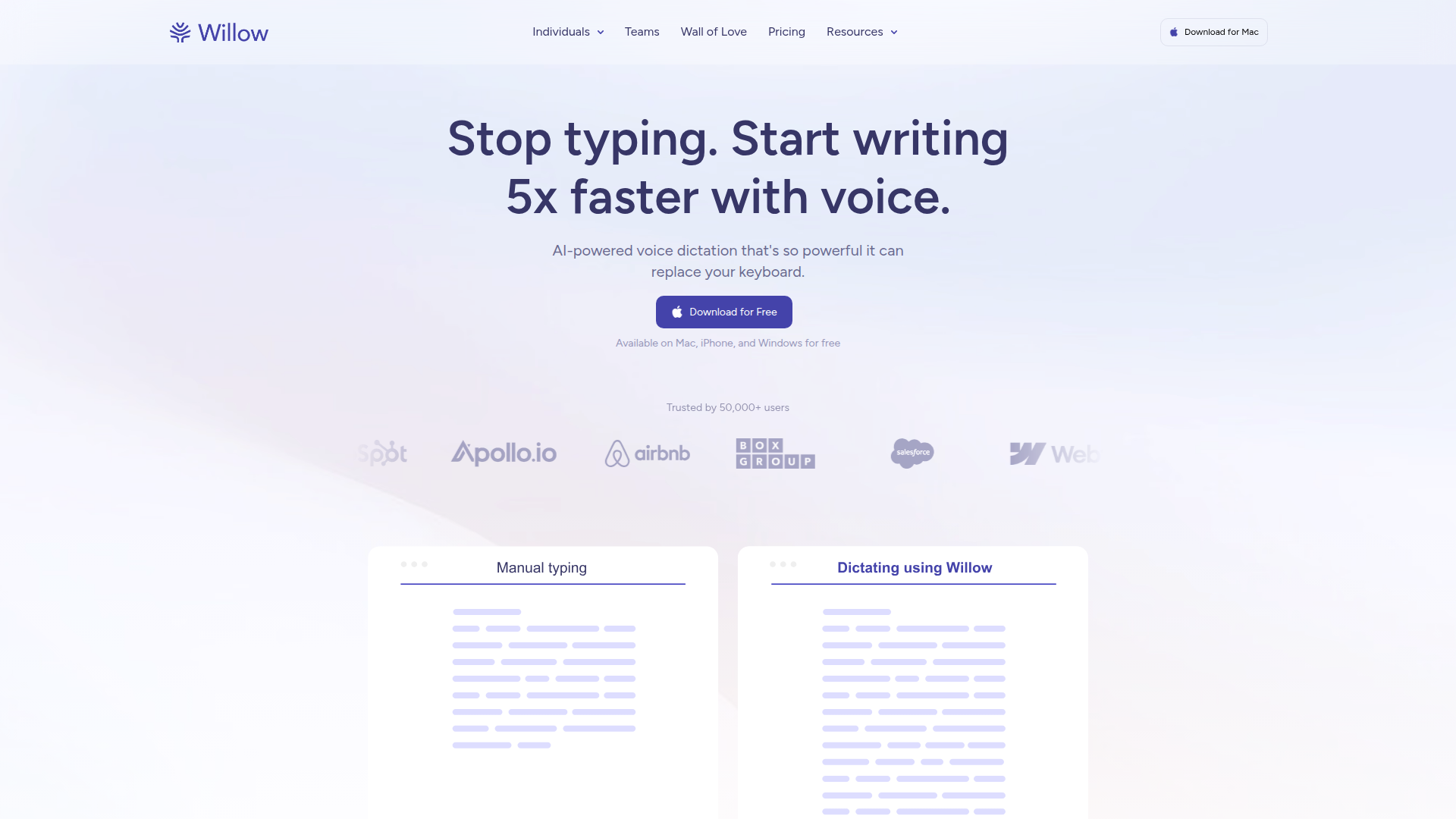 A voice AI tool for teams that converts speech into written output so users can draft and edit work with dictation, reducing reliance on typing for day-to-day documentation and writing tasks.