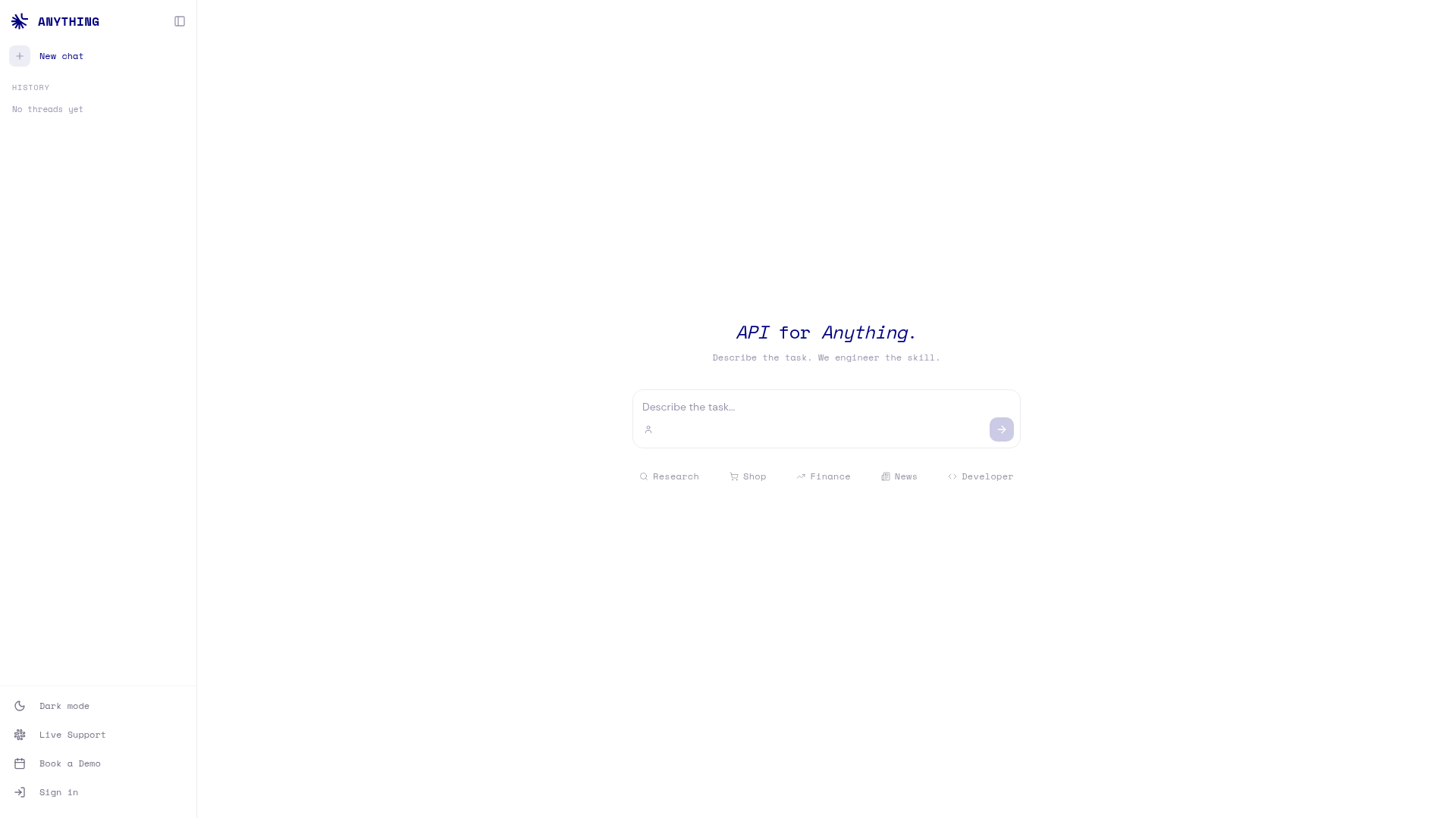 Anything API is a service that allows users to describe tasks in natural language and automatically engineers the necessary skills to execute them. The platform provides API access for various domains including research, shopping, finance, news, and developer tools. Users can simply describe what they want to accomplish, and the system handles the technical implementation through its API interface.