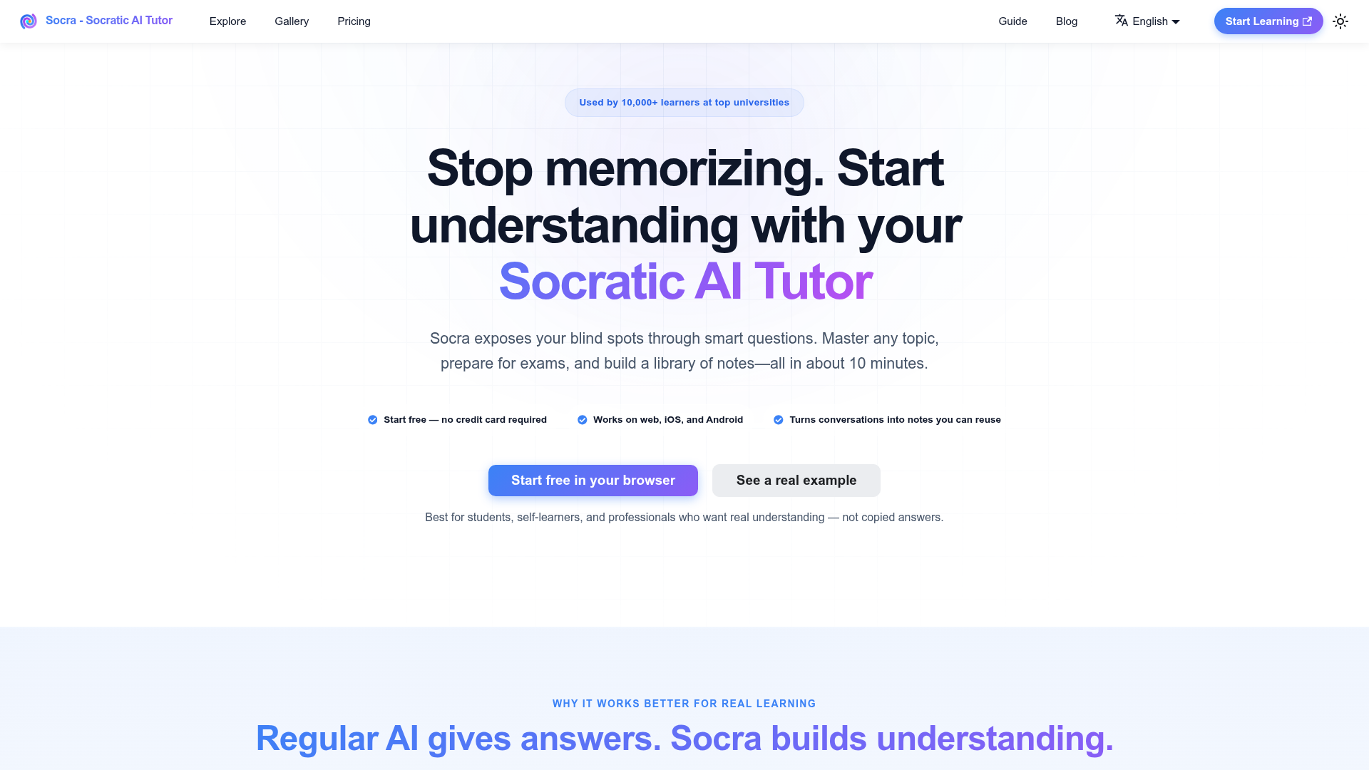 Socra is a Socratic AI learning platform that uses guided questions and active recall to help users build deep understanding of complex topics. Unlike standard AI chatbots that provide direct answers, Socra asks questions to make users recall, explain, and reason through concepts in their own words. The platform converts learning sessions into reusable notes and study materials, making it suitable for exam preparation, self-study, and professional development across web, iOS, and Android platforms.