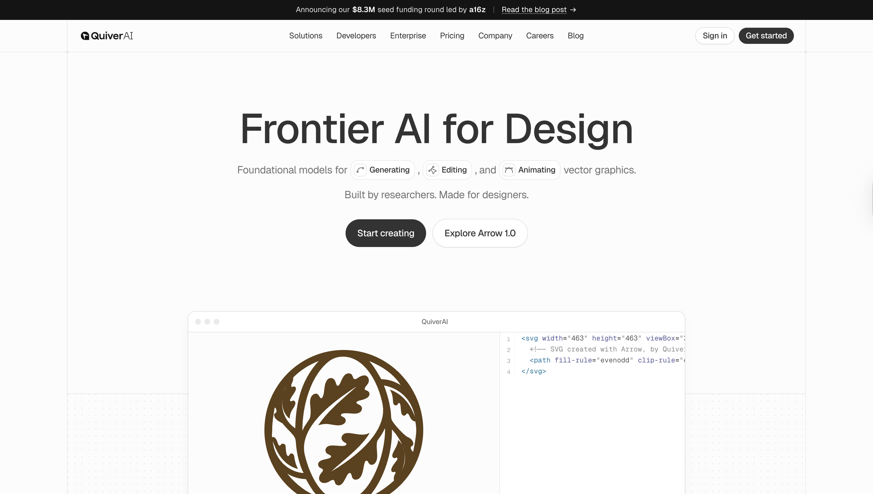 QuiverAI is a foundational AI platform for vector design that helps teams generate, edit, and animate editable SVG assets. The platform offers AI-powered vector generation from text prompts, with outputs that can be edited and animated for product, brand, and marketing workflows. Built by researchers for designers and developers, it provides both web interface and API access. The company recently announced an $8.3M seed funding round led by a16z.
