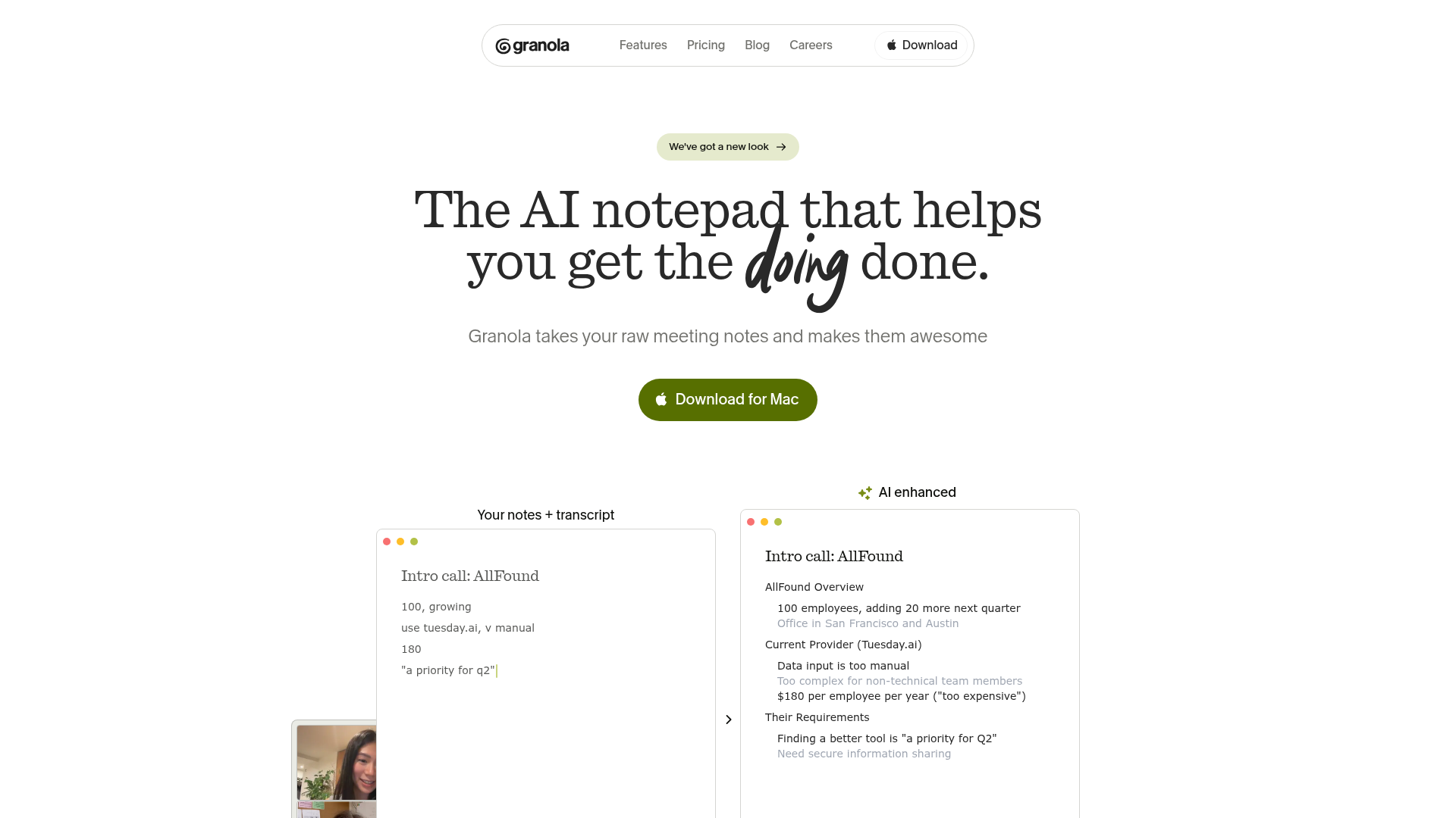 Real-time audio transcription without meeting botsAI-enhanced note formatting and organizationCustomizable templates for different meeting typesCross-platform compatibilityBuilt-in AI chat for post-meeting tasksWorks with all major meeting platforms