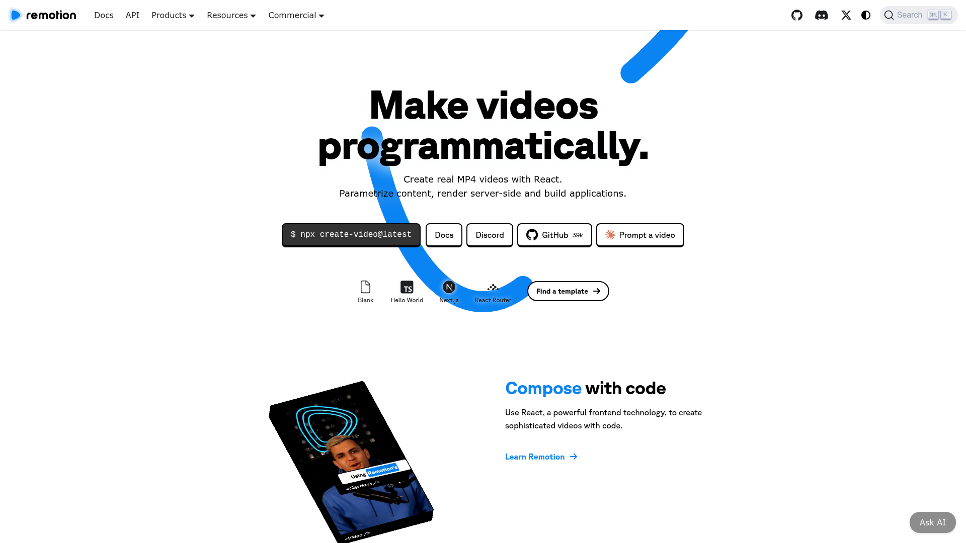 Remotion is a programmatic video creation framework that allows developers to create MP4 videos using React components. It provides tools for composing videos with code, dynamic editing through parameterization, and scalable rendering options including local, server, and serverless deployment. The platform includes Remotion Studio for editing, a Player component for embedding videos, and various templates for common use cases like music visualization, captions, and screencasts.