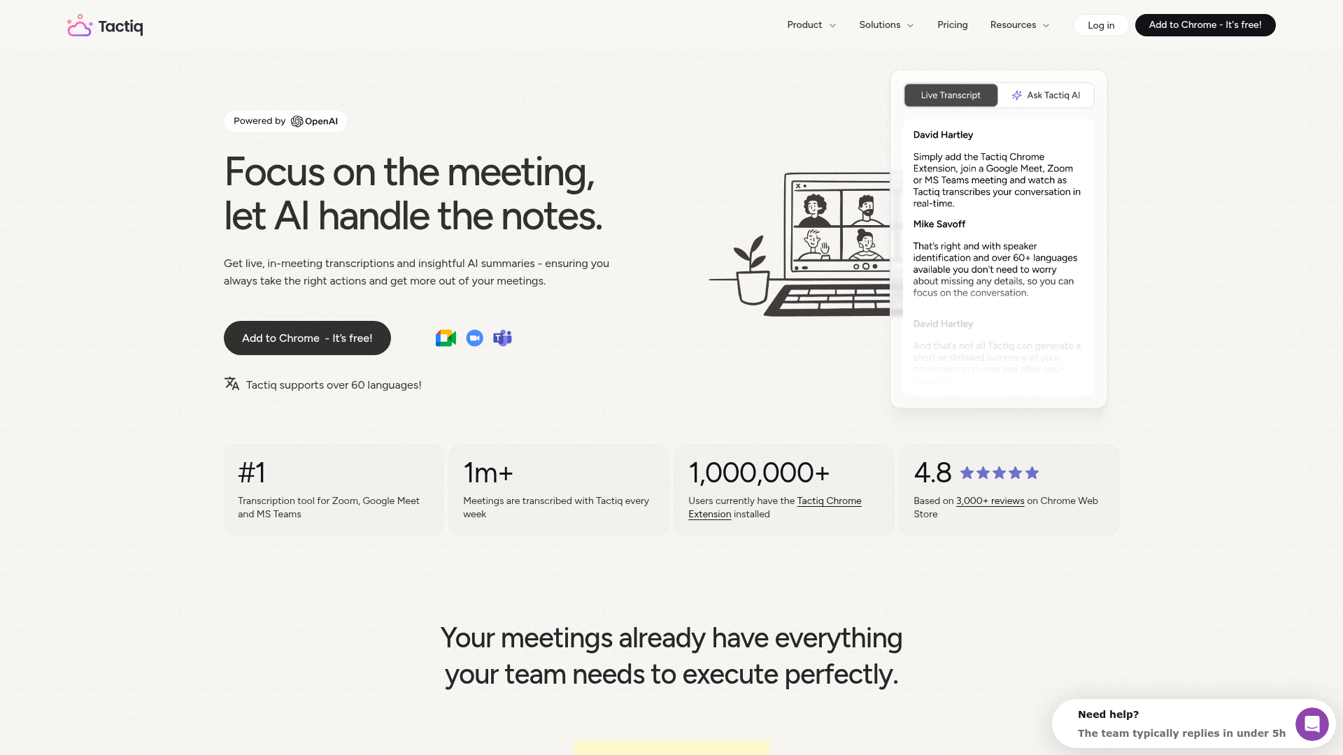 Tactiq is a Chrome extension that provides real-time meeting transcription and AI-powered summaries for Google Meet, Zoom, and Microsoft Teams. The platform offers live transcription without requiring a bot to join meetings, supports over 60 languages, and includes features for generating action items, custom AI prompts, and workflow automations. Users can ask AI questions during meetings, create one-click summaries, and integrate with tools like Slack, Notion, Linear, and HubSpot to share meeting insights across their workflow.