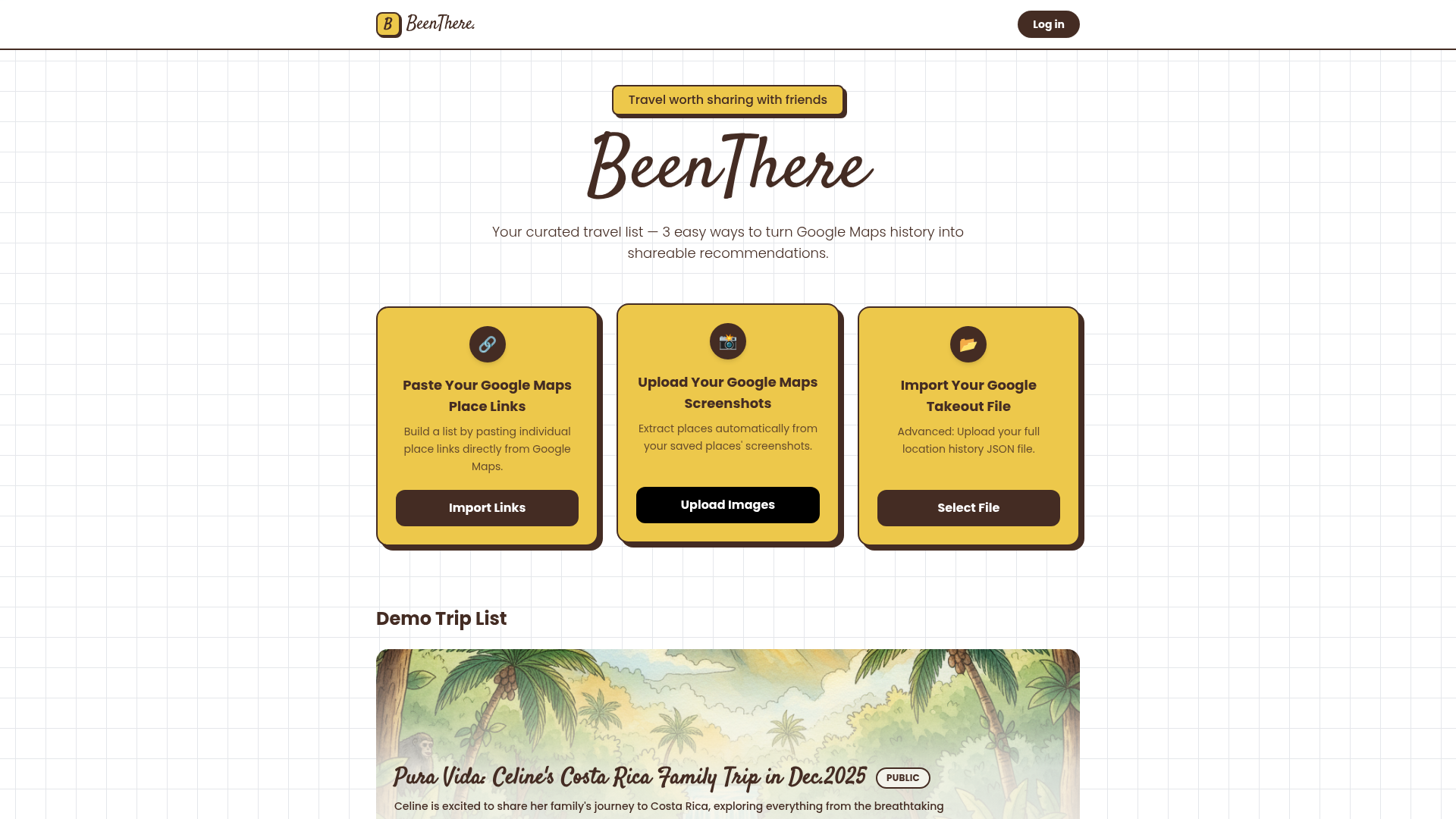 BeenThere is a travel planning platform that enables users to create and share beautiful travel trip lists integrated with real Google Maps data, including photos and ratings. The service helps travelers organize their adventures and share recommendations with others through visually appealing trip itineraries.