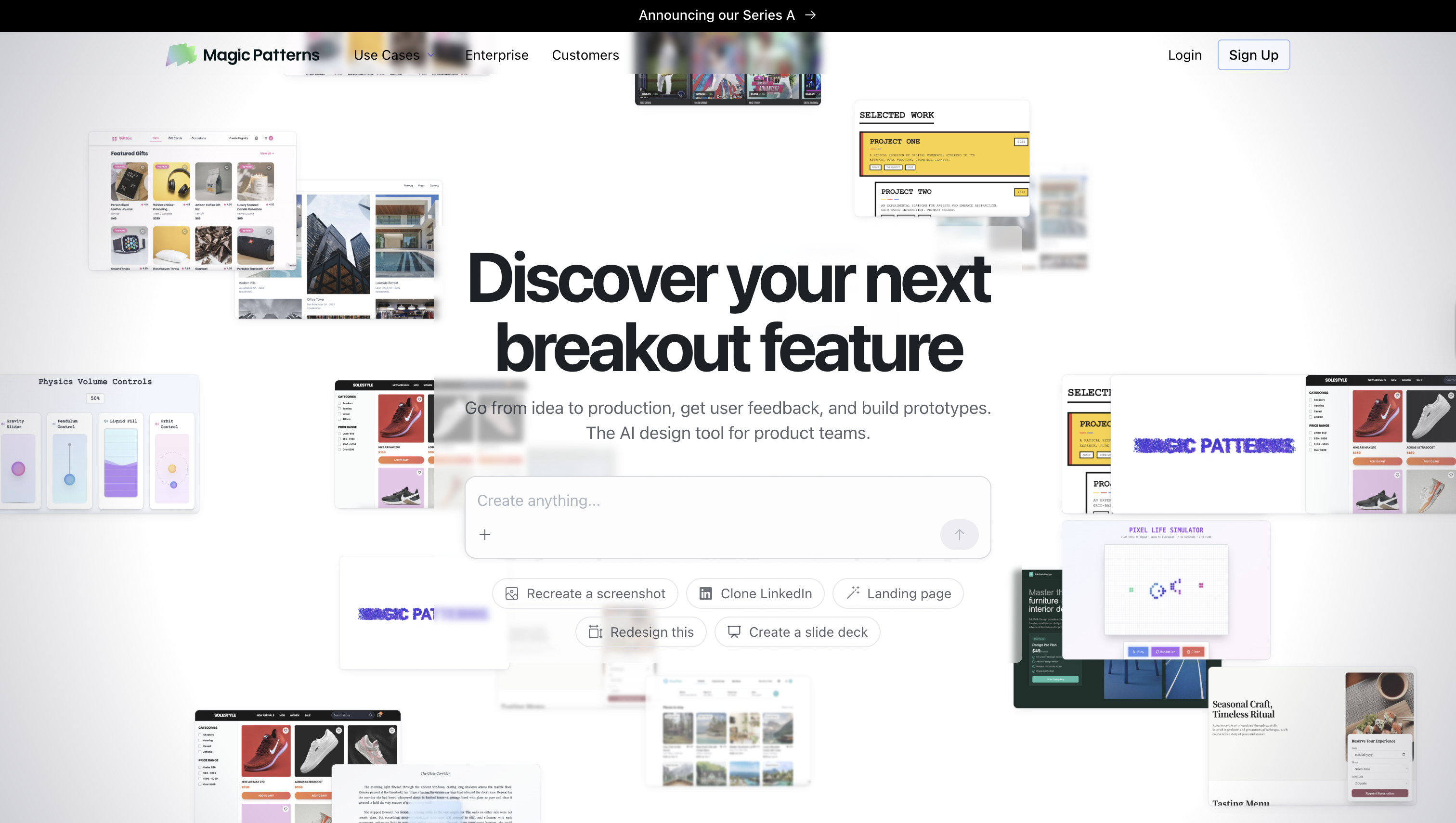 Magic Patterns is an AI prototyping tool that transforms text prompts into production-ready UI components. The platform allows product teams to generate prototypes that match their existing design systems, collaborate in real-time, and test ideas with customers quickly. Trusted by companies like DoorDash, KPMG, and Vanta, it supports over 1,000,000 community-created designs and offers enterprise-grade security features.