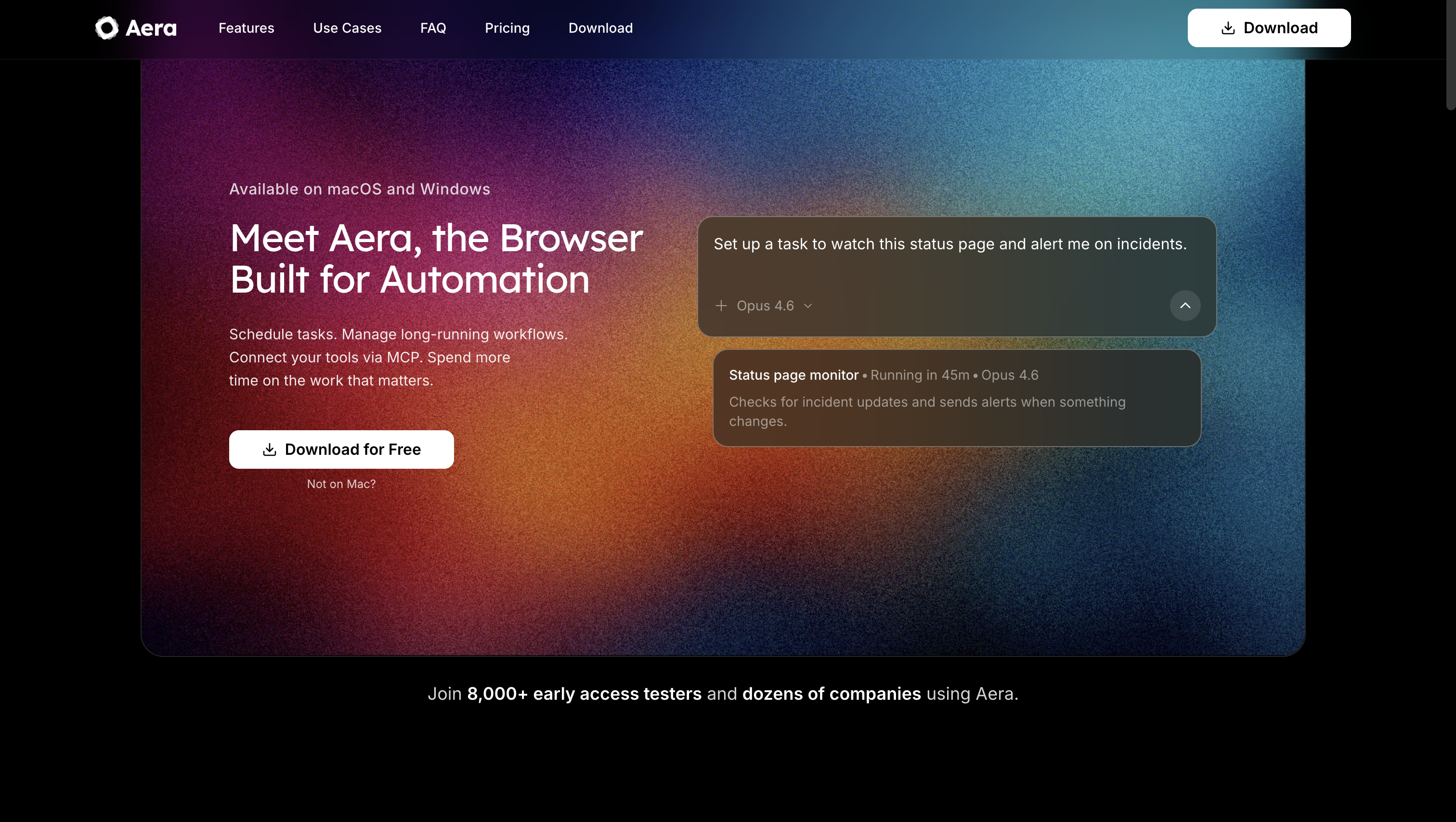 Aera Browser is a specialized browser built for automation that allows users to create and schedule fully-autonomous web workflows. It can handle repetitive tasks like checking websites, copying data between applications, filling forms, and managing long-running processes in the background. The browser integrates with tools via MCP (Model Context Protocol), supports multiple AI models, and provides notifications when tasks are completed, helping users reclaim time for more important work.