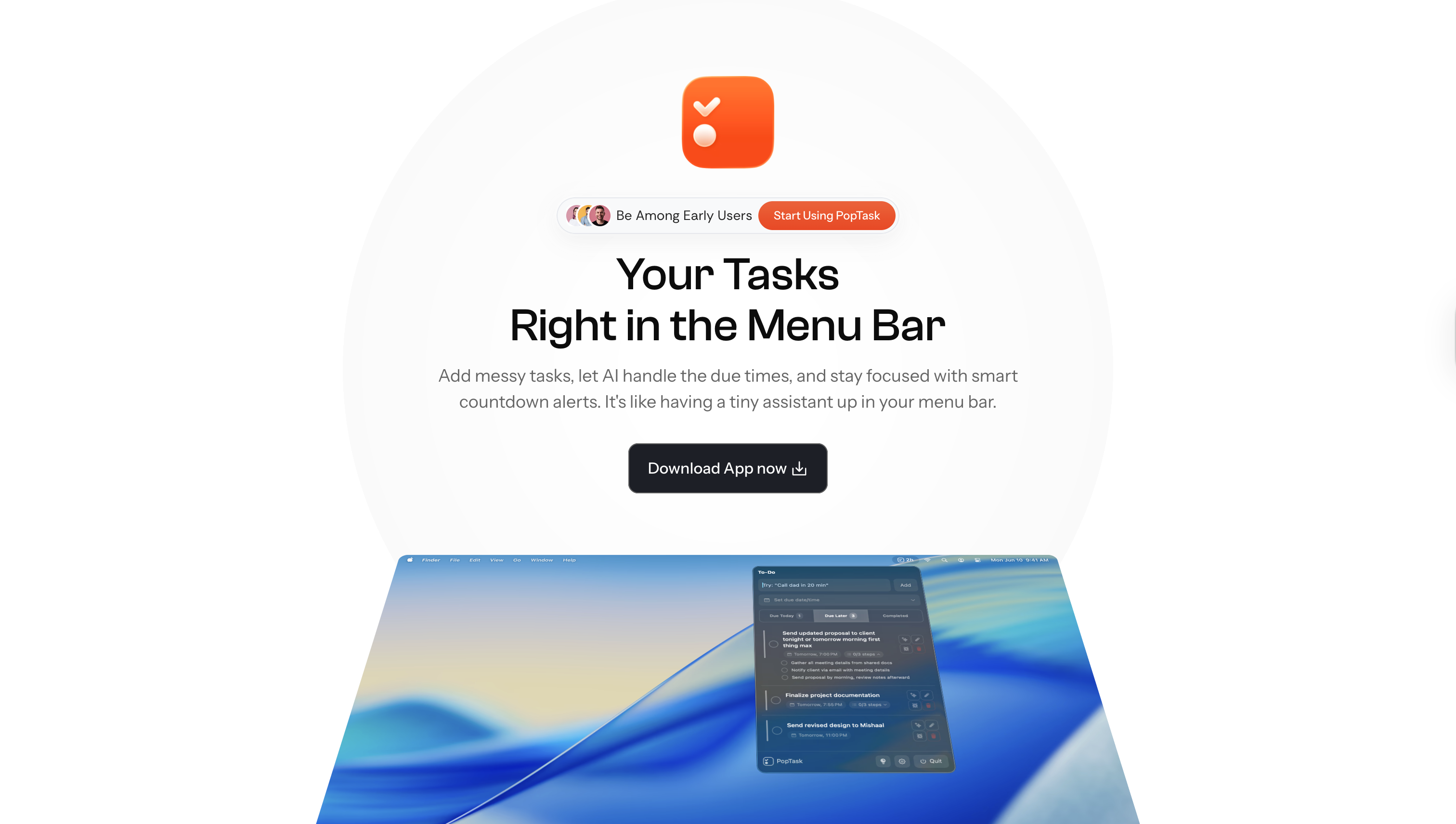 PopTask is a lightweight macOS menu bar task manager that allows users to add tasks instantly, receive smart countdown alerts, and utilize AI-powered scheduling and task breakdown features. It offers on-device processing for macOS 26+ with cloud support for earlier versions.