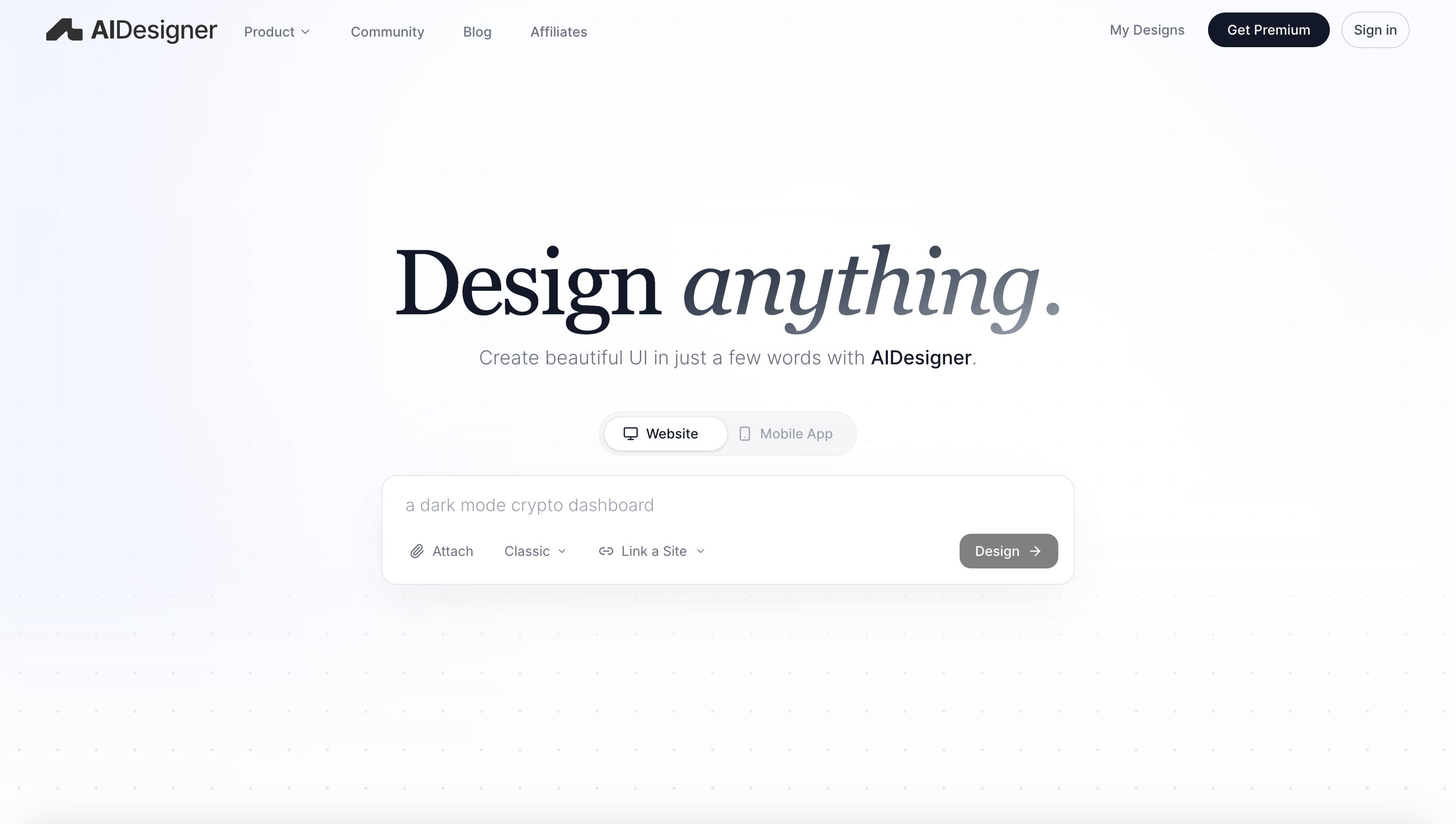 AIDesigner is an AI-powered UI/UX design platform that generates production-ready designs from text prompts. The platform offers multiple design modes including website and mobile app creation, along with features like website cloning, prototype generation, and ASCII art creation. It includes a template library and MCP server integration for connecting with AI coding assistants. The tool positions itself as creating designs so sophisticated they appear human-made.